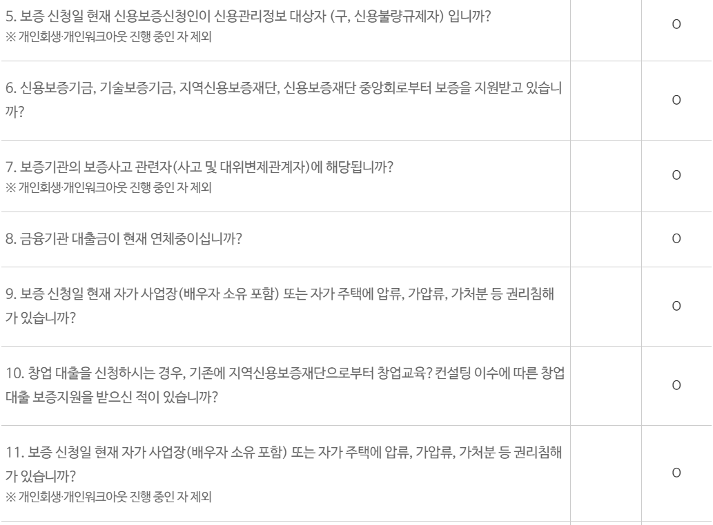 신용보증신청서, 사업자등록증 사본 등 사업사실 확인서류, 임차계약서 사본(사업장 및 거주주택), 주민등록등본, 금융거래확인서, 소득금액증명원 등 소득금액 확인서류, 변제금납입확인서(회생지원 프로그램 성실이행), 창업교육・컨설팅 이수 확인서류 등(창업기업), 대부업 채무정보 조회서(대환대출)