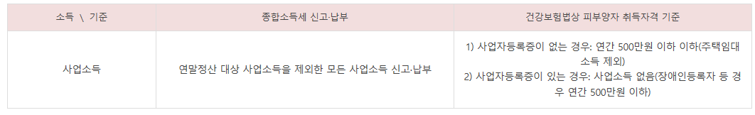 세부적으로 보자면 다음과 같습니다. 사업자등록증이 없는 경우 주택임대소득이 있을 때를 제외하고 연간 사업소득 합계액이 500만 원 이하라면 피부양자가 될 수 있습니다. 사업자등록증이 있는 경우에는 피부양자에 해당하려면 사업소득이 없어야 합니다. 다만, 사업자등록증이 있는 경우에도 장애인등록자, 국가유공상이자, 보훈보상상이자에 해당하는 경우는 사업소득 합계액이 500만원 이하면 피부양자가 될 수 있습니다.