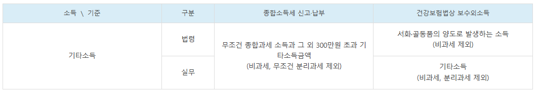해당 조문을 그대로 해석하면 보수외소득 산정시 기타소득 중 서화·골동품의 양도로 발생하는 소득에 대해서만 고려한다는 것처럼 보입니다. 그러나 실제 건강보험공단 측에 확인해 보면 이는 현재 시행규칙이 잘못되어 있는 것이며, 보수외소득 산정시 고려하는 기타소득은 비과세를 제외한 모든 기타소득임을 확인할 수 있습니다.