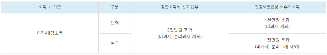 또한, 건강보험법에서는 비과세되는 소득만 보수외소득에서 제외한다고 규정하고 있습니다. 따라서 해당 규정을 문리해석하면 무조건 분리과세되는 이자소득과 배당소득은 종합소득세 신고·납부에서는 제외되지만 보수외소득에는 포함됩니다.