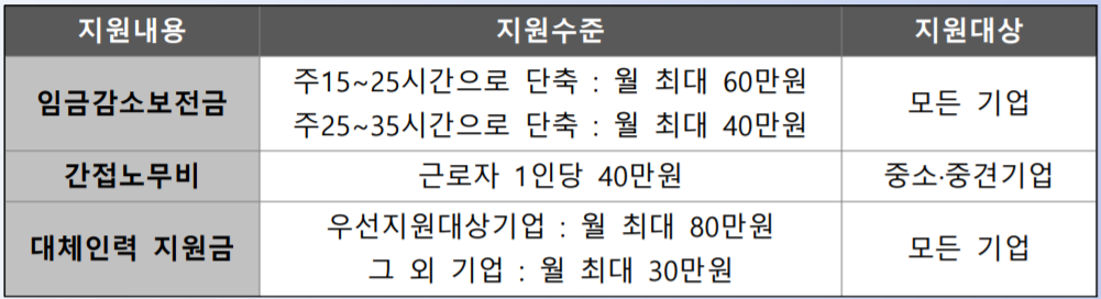이 지원금으로 사업주는 근로시간 단축에 따라 줄어든 근로자의 급여를 보전해 줍니다.