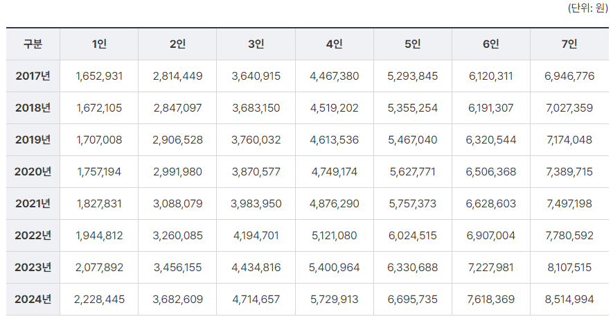 | 기준중위소득 | 1인 | 2인 | 3인 | 4인 | 5인 | 6인 |