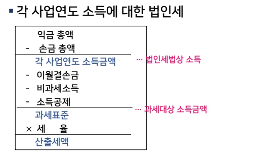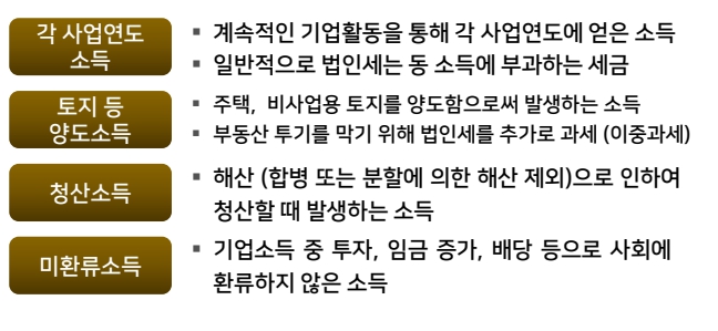 • 법인이 계속적인 기업활동을 통하여 각 사업연도에 얻은 소득에 대하여 부과