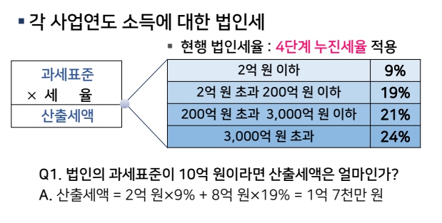Q2. 법인의 과세표준이 2,000억 원이라면 산출세액은 얼마인가? A. 산출세액 = 2억 원×9% + 198억 원×19%