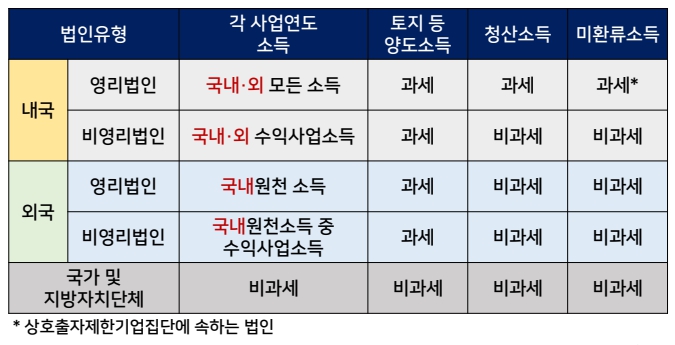 • 영리법인: 법인에게 귀속되는 모든 소득 과세 (소득의 발생원천 불문)
