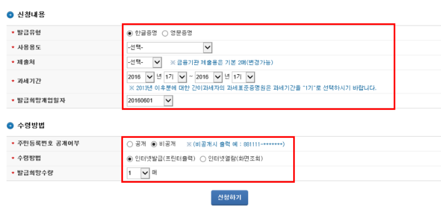 제출처(금융기관/관공서/조합 등)와 수령방법 선택 후 [신청하기] 진행해주시면 됩니다.
