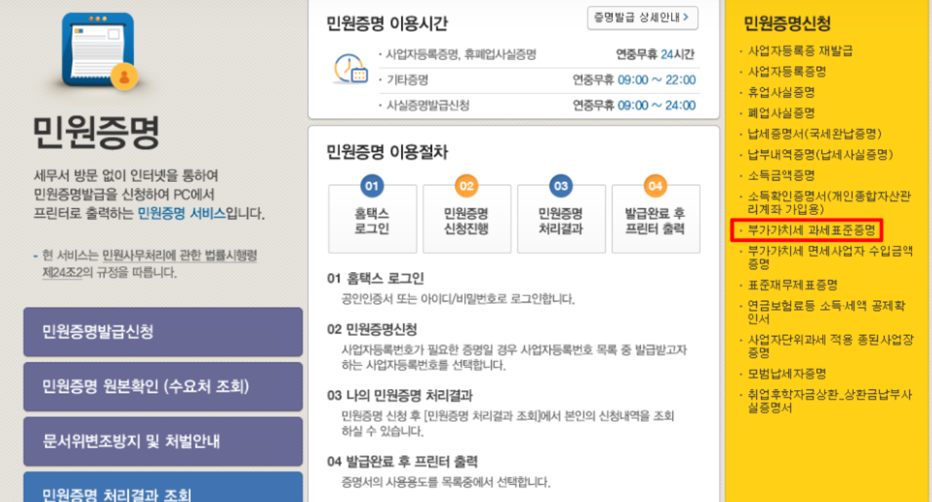 ▶홈택스 > 민원증명>부가세 과세표준증명원