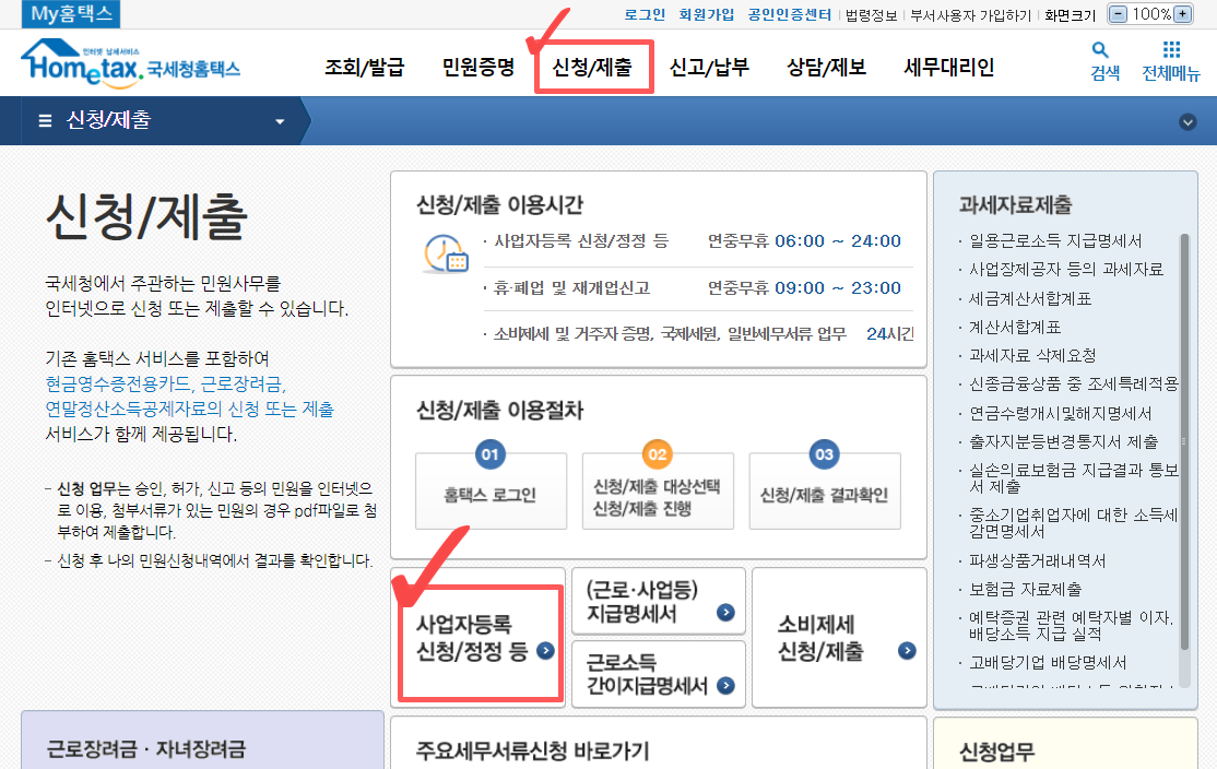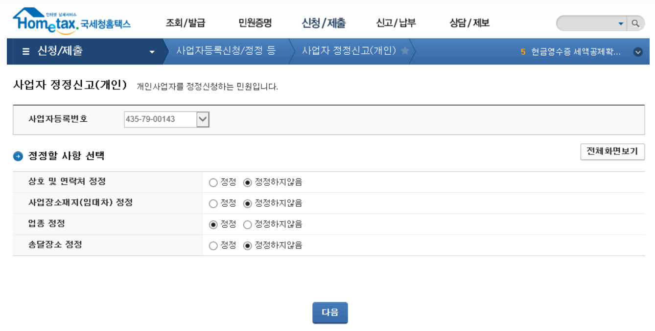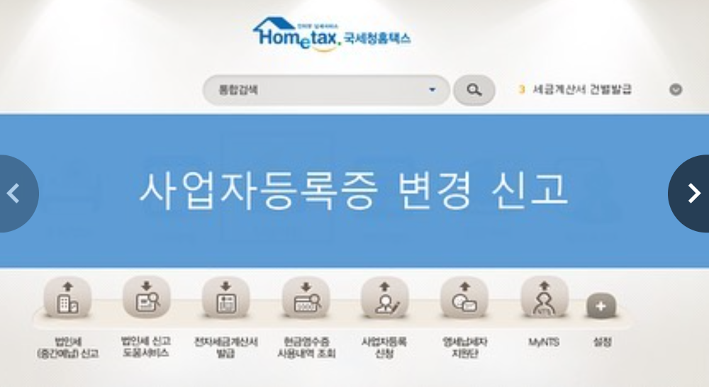 사업자등록증 업종 추가를 위해서 사업자등록정정신고서를 작성하여 가까운 세무서를 방문하거나 홈택스의 사업자등록 신청/정정을 통해서도 가능하다.