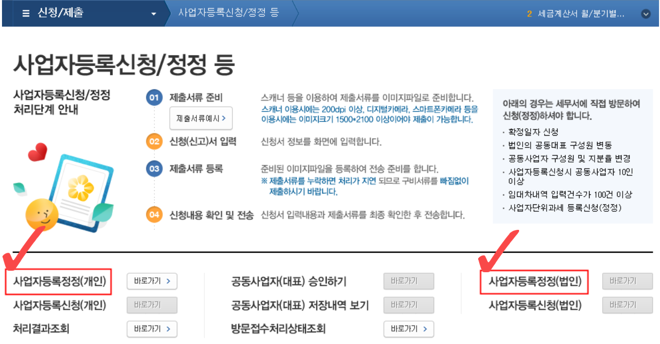 아래의 경우는 세무서에 직접 방문하여 신청(정정)하셔야 합니다.