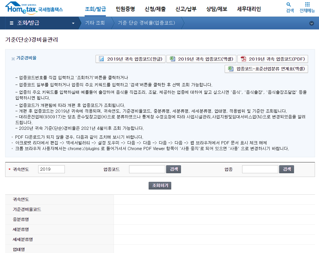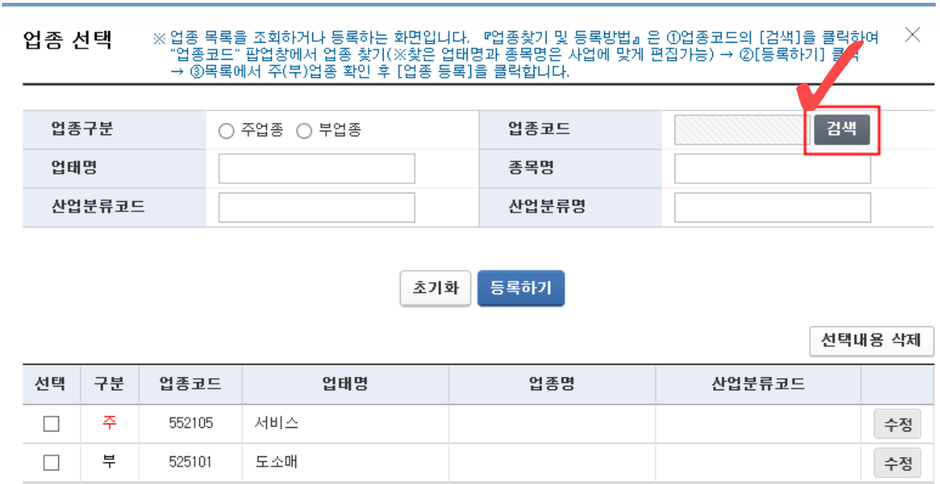 홈택스에서 사업별 업종코드를 검색할 수 있습니다.