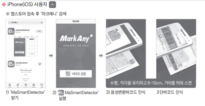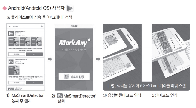 전용애플리케이션(마크애니)을 통해 사업자등록증상·하단의바코드를인식할경우, 화면에표출되는 문구및 음성과사업자등록증을 대조하여진위여부를확인할 수있습니다.