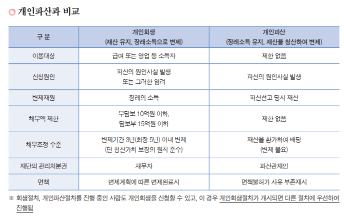 이때 일정한 소득이 있는 경우에는 회생, 소득이 없거나 있어도 최저생계비 이하인 경우에는 파산을 신청해야 한다.