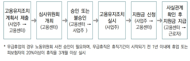 경영악화 등으로 고용조정이 불가피하게 된 사업주가 고용유지조치(휴업, 휴직, 무급휴업·휴직 등)를 실시하는 경우 지원금을 지원함으로써 근로자의 실업 예방 및 생계안정 유지