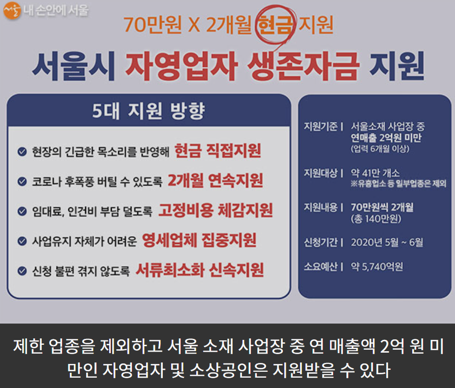 서울시가 코로나19로 인해 매출이급감하고 어려운 현실에 맞닥뜨린 영세 자영업자·소상공인을 위해 ‘자영업자 생존자금’을 월 70만원씩 2개월간 현금으로 긴급 지원하는 내용입니다.
