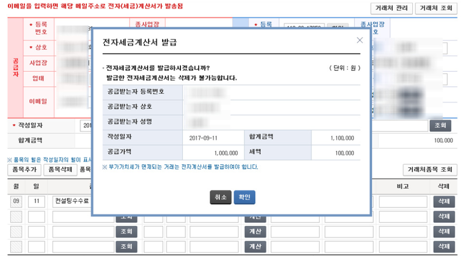 전자세금계산서 발급 전 최종화면