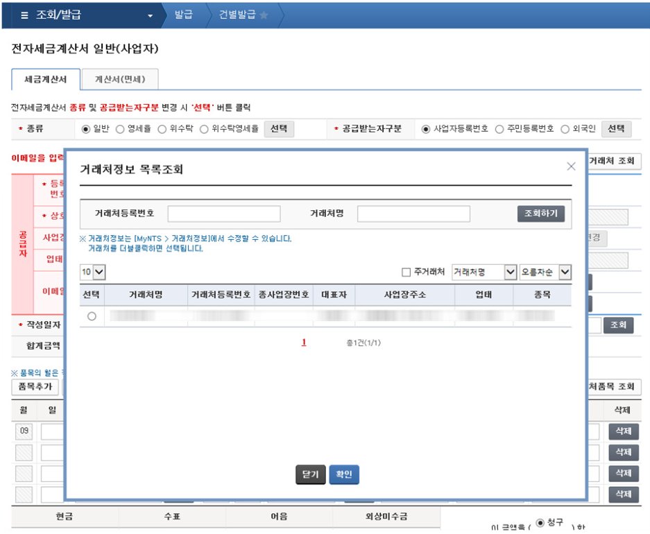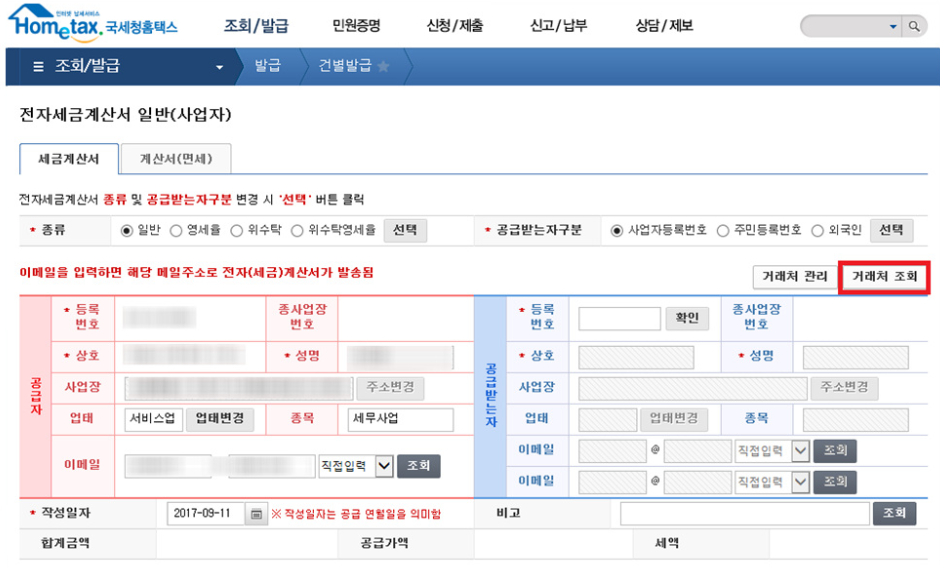 기존에 발행한 거래처가 있다면 거래처조회를 클릭하여 거래처를 선택할 수 있으며, 최초 발행시에는 공급받는 거래처 정보를 입력해야 합니다.