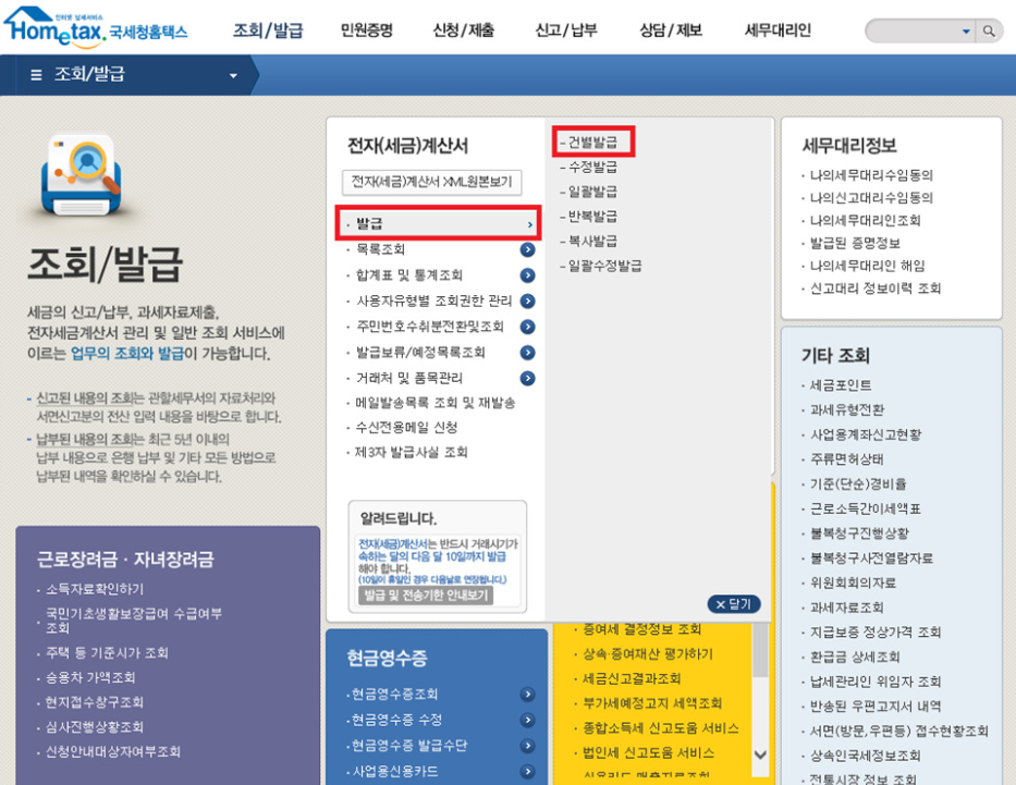 전자(세금)계산서 ▶ 발급 ▶ 건별발급을 클릭