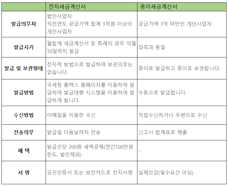 종이는 종이에 작성해서 전달하는 세금계산서이고, 전자는 '전자적 방법'으로 발급하고 전송하는 세금계산서입니다.