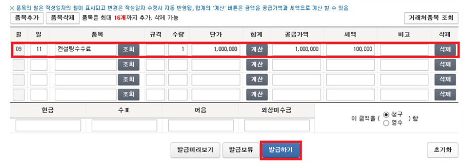 발급미리보기를 해서 맞게 입력되었는지 확인한 후 발급하기를 클릭
