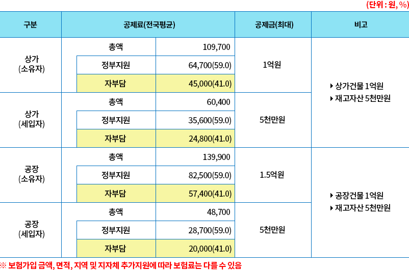 * 소상공인 풍수해공제료(1년납) 및 공제금(보험금) 예시