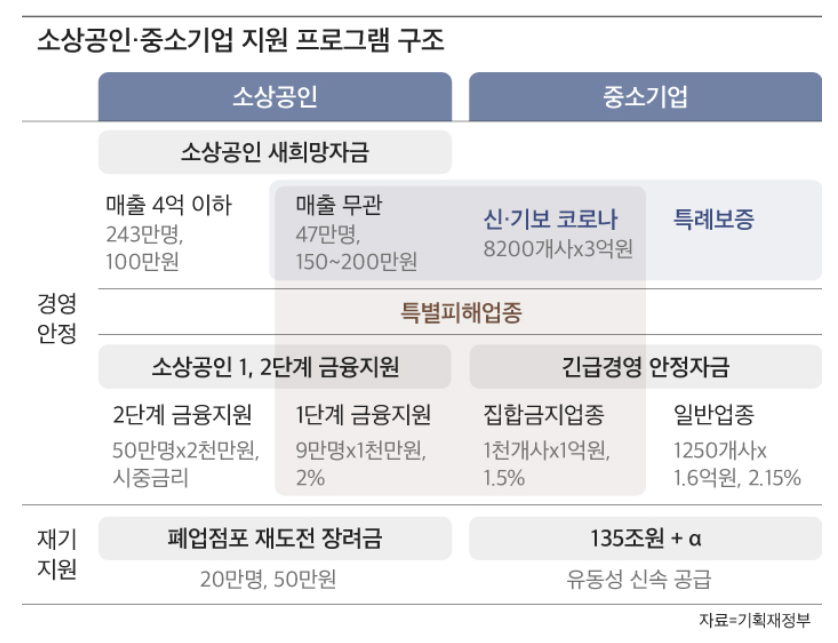 특히 매출 급감으로 인해 경영안정이 시급한 소상공인을 위해 3조 2000억원의 새희망자금을 신설, 291만명에게 최대 200만원을 지원한다.