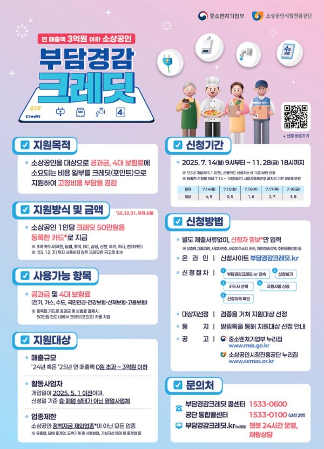 첫번째 소개드릴 지원은 소상공인 부담경감 크레딧입니다. 연매출 3억원 이하의 소상공인을 대상으로 전기, 수도, 가스 등 공공요금과 4대 보험료(국민연금, 건강보험, 산재보험, 고용보험) 납부에 사용할 수 있는 연간 최대 50만원 상당의 디지털 크레딧이 지급됩니다.