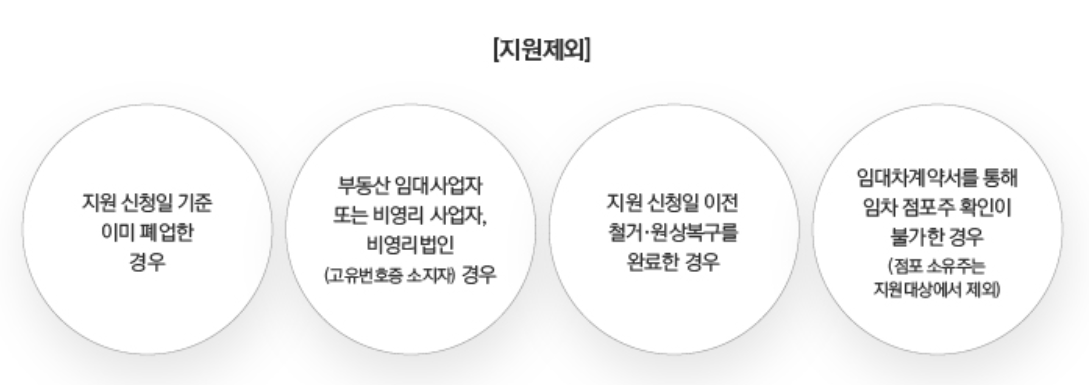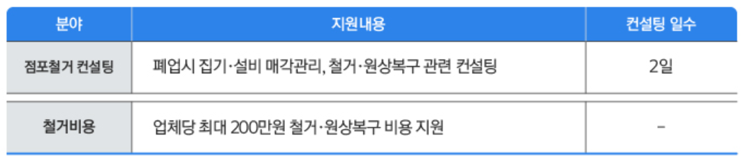 목적 : 점포 철거·원상복구 관련 상담·지도(컨설팅)와 실행비용 지원을 통해 소상공인의 폐업 부담 완화