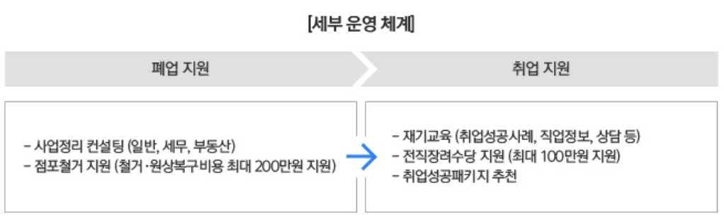 경영상의 어려움으로 폐업 후 취업을 희망 하거나 준비하는 소상공인에게 폐업에서 취업까지 전 과정을 지원하는 제도 입니다.