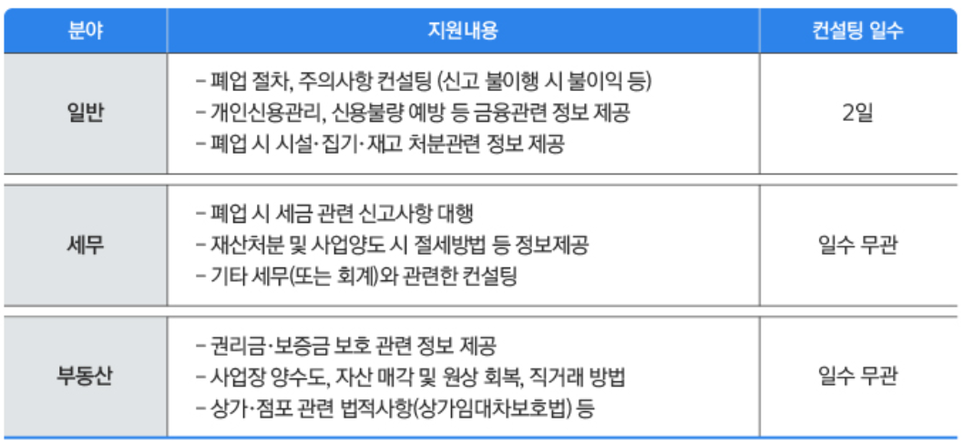 목적 : 폐업예정 소상공인 대상으로 사업정리 과정에서 필요한 상담·지도(컨설팅) 제공으로 소상공인의 안정적 폐업지원대상 : 취업 또는 재창업 의사가 있는 폐업예정 또는 이미 폐업한 소상공인으로 신청일 기준 사업운영기간*이 60일 이상인 경우