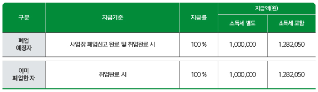 - 요건 : 사업정리 상담·지도(컨설팅) 또는 재기교육 수료, 폐업신고와 취업활동을 하는 자로서, 아래의 요건 모두 갖춰야 함