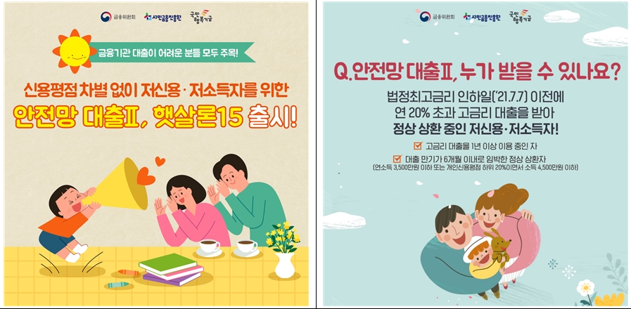 금융위원회에 따르면 정부는 7일 법정 최고금리를 인하함과 동시에 '안전망 대출Ⅱ'와 '햇살론15'를 지원할 계획이다.