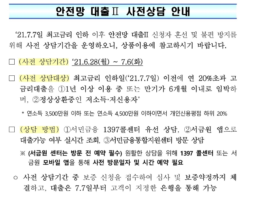 ※ 안전망 대출Ⅱ는 '21.7.7일 이후 연 20%초과금리 대출을 대환해주는 상품입니다.(단, '21.7.7일 이후에도 연체 없이 20% 초과 고금리 대출을 정상 상환 중인 분이 대상입니다. 대환 실행은 '21.7.7일부터 가능합니다.)
