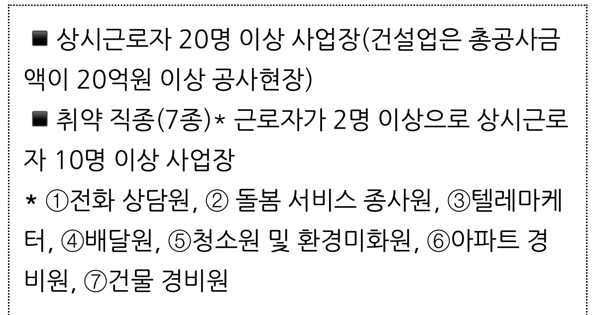 * 전국 48개 지방노동관서에 휴게시설 관련 전담 감독관 지정 및 휴게 환경이 취약한 건설 현장, 청소·경비 직종 종사 업종 등을 중심으로 집중 점검 실시