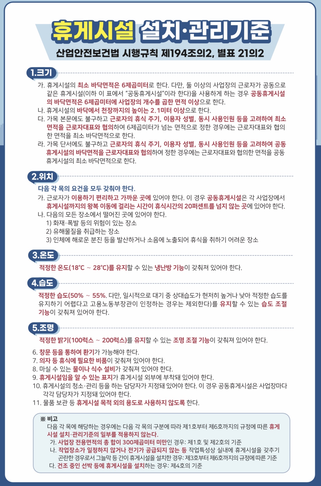 근로자가 적절한 휴식을 취할 수 있는 휴게시설을 반드시 설치해야 하며, 휴게시설을 설치하지 않거나, 고용노동부 장관이 정하는 설치·관리 기준을 위반할 경우 과태료를 부과 받습니다.
