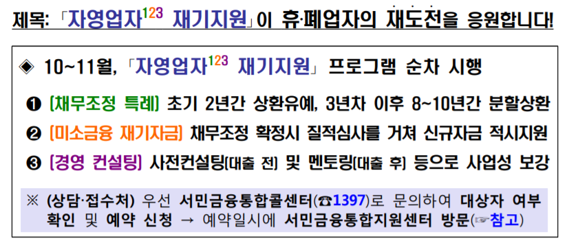 빚을 진 채 휴업하거나 폐업한 자영업자들이 재도전할 수 있도록 돕는 프로그램자영업자123