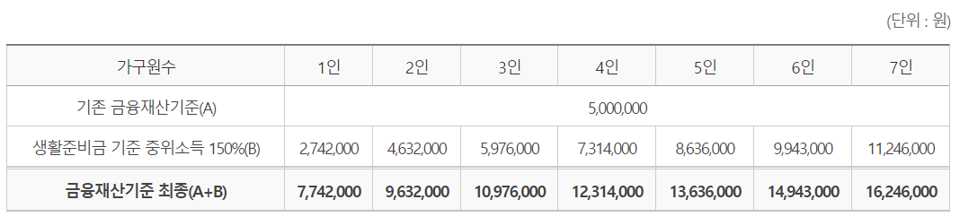 예금, 적금, 주식 등의 금융재산이 1인가구는 74만 원,4인가구는 1,231만 원, 7인가구는 1,624만 원 이하가 되면 금융재산기준을 충족하게 된다.
