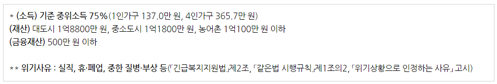 실직, 휴‧폐업, 화재, 중한 질병 등 위기사유 발생으로 생계에 어려움이 있는 가구 중 중위소득 75%이하(4인기준 365만원), 재산이 중소도시 기준 1억 1800만 원 이하, 금융재산이 500만 원 이하 인 저소득 가구에 대해 4인기준 생계지원 123만 원, 의료 300만 원 이내로 지원하고 있다.