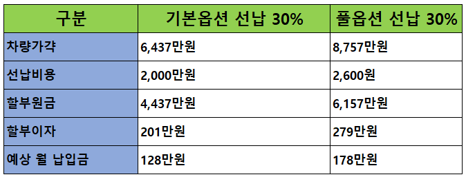 선납금 30%을 납부한다면 기본 모델은 2천만 원을, 풀옵션은 2,600만 원을 우선 납부해야 하며, 할부 이자는 기본 약 201만 원, 풀옵션 약 279만 원이 발생한다. 월 납입금은 기본 128만 원, 풀옵션 178만 원이 나온다.
