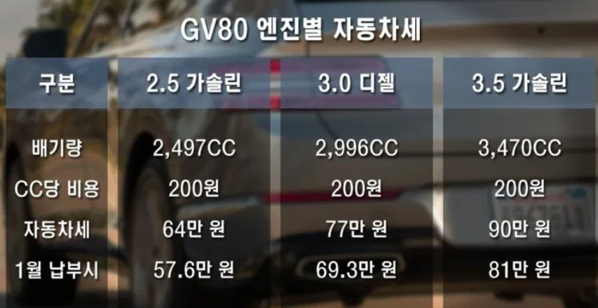 GV80의 경우 모든 엔진의 배기량이 2.0리터를 넘기 때문에 cc 당 200원이 부과된다.