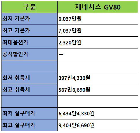 선납금 없이 GV80을 구매한다면 기본 모델은 약 291만 원의 이자가 발생하며 월 납입금은 약 187만 원, 풀옵션 모델은 약 397만 원의 이자가 발생하여 월 254만 원씩 납부해야 한다.