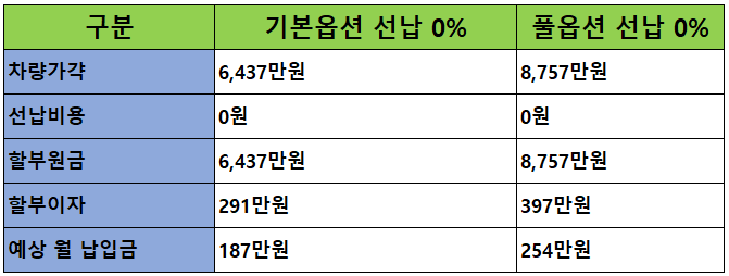선납금 30%을 납부한다면 기본 모델은 2천만 원을, 풀옵션은 2,600만 원을 우선 납부해야 하며, 할부 이자는 기본 약 201만 원, 풀옵션 약 279만 원이 발생한다. 월 납입금은 기본 128만 원, 풀옵션 178만 원이 나온다.
