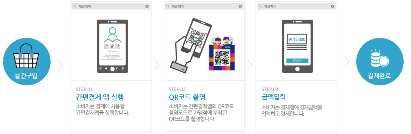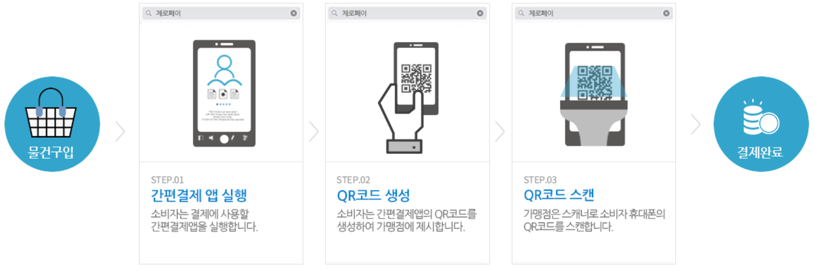 1. 소비자 휴대폰의 간편결제 앱으로 가맹점에 부착된 QR코드를 촬영