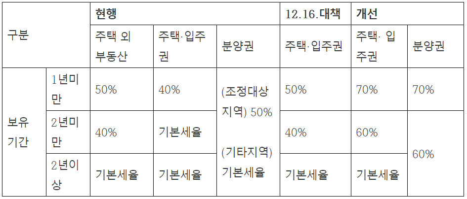 -1년 미만 40→70%, 2년 미만 기본세율→60%