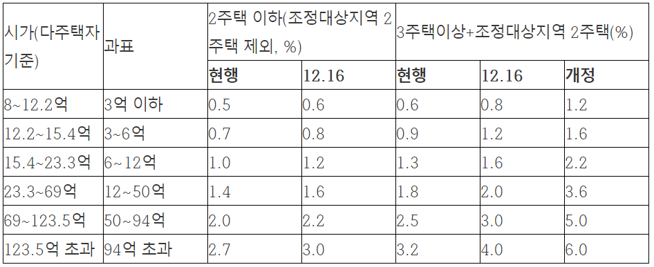 *개인-3주택 이상 및 조정대상지역 2주택, 과세표준 구간별로 1.2%~6.0% 세율 적용