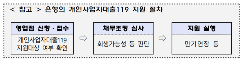 일시적인 자금부족으로 대출원리금 상환이 어려운 개인사업자는 연체기간이 3개월을 넘기기 전에 거래은행에 개인사업자대출 119 지원이 가능한지 여부를 상담하시기 바랍니다.
