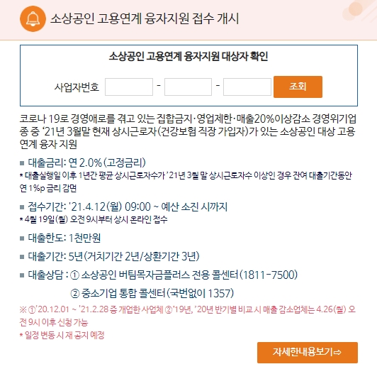 코로나 19로 경영애로를 겪고 있는 집합금지·영업제한·매출20%이상감소 경영위기업종 중 ‘21년 3월말 현재 상시근로자(건강보험 직장 가입자)가 있는 소상공인 대상 고용연계 융자 지원 - 상세보기