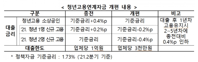 청년 고용 소상공인이 대출 후 1년간 고용을 유지하는 경우 1년 차에 1.73~2.13%이던 금리가 2년 차부터 0.4%p 낮은 1.33~1.73%로 인하된다.
