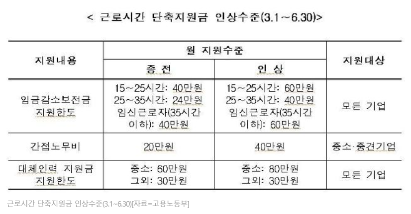 대기업도 지원하는 임금감소 보전금은 주 15시간 이상 25시간 미만 근로시간 단축시 40만원에서 60만원으로, 주 25시간 이상 35시간 이하 단축시 24만원에서 40만원으로 인상했다.