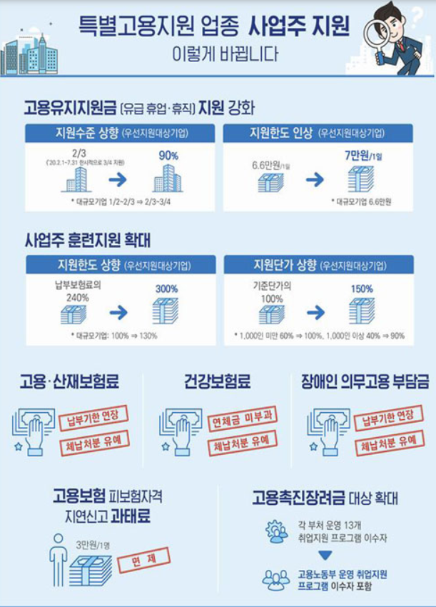사업주에 대한 고용유지지원금 지원 수준은, 우선지원대상기업의 경우 원래 휴업ㆍ휴직수당의 최대 66%(7월31일까지는 한시적으로 75%로 상향)까지였지만 이번 특별고용지원 업종 지정에 따라 90%까지로 상향되며, 1일 지원한도도 6만6,000원에서 7만원으로 높아진다.