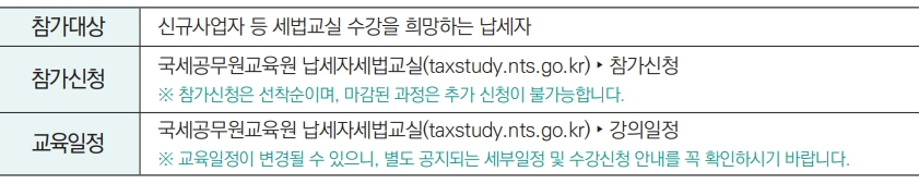 국세공무원교육원은 세금신고 및 납부 등에 어려움을 겪는 영세납세자에게 도움을 드리고자 납세자 세법교실을 운영하고 있습니다.